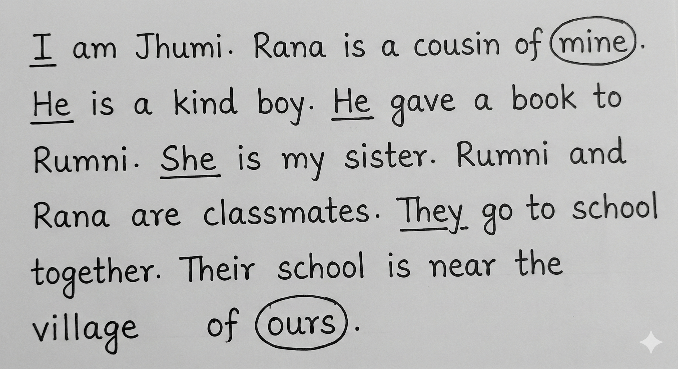 I am Jhumi. Rana is a cousin of mine. He is a kind boy. He gave a book to Rumni. She is my sister. Rumni and Rana are classmates. They go to school together. Their school is near the village of ours.